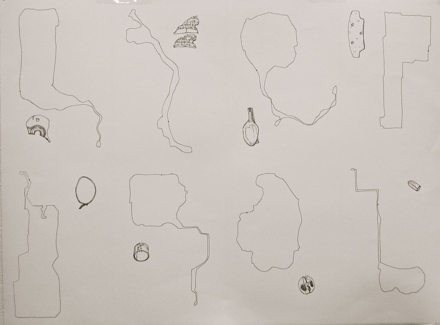 In addition to picking up an object on each walk, I also record the shape of my walking route as though seen from an aerial perspective. I record these routes from memory and it is a way to physically retrace the path that I took and possess a portion of my time in the landscape. The recorded shape of the walk and the found object are the only tangible things that I have to show from my walking experience and they stands in for the other, intangible aspects that are resistant to representation