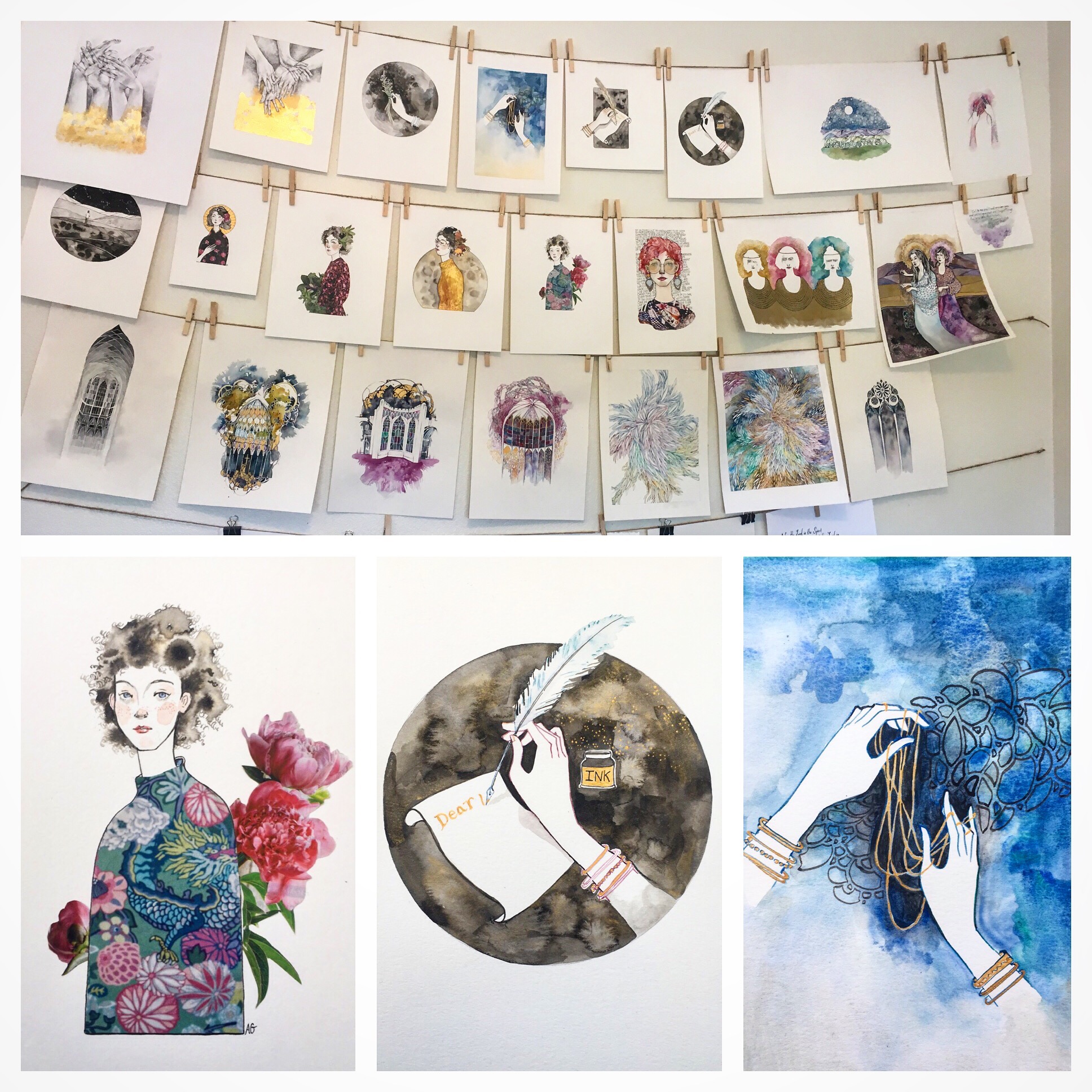 But it is precisely this unforeseen quality that I have embraced and love in this new series of work! Rather than feeling frustrated at my inability to control the materials, I have allowed them to create a story for me. The puddles, splatters, drips and spreading shapes provide the backdrop for the small narrative world in each piece and it is then my job to explore and add meaning to what has been created. Every piece feels like an experiment with an unknown outcome and a collaboration with the materials themselves.